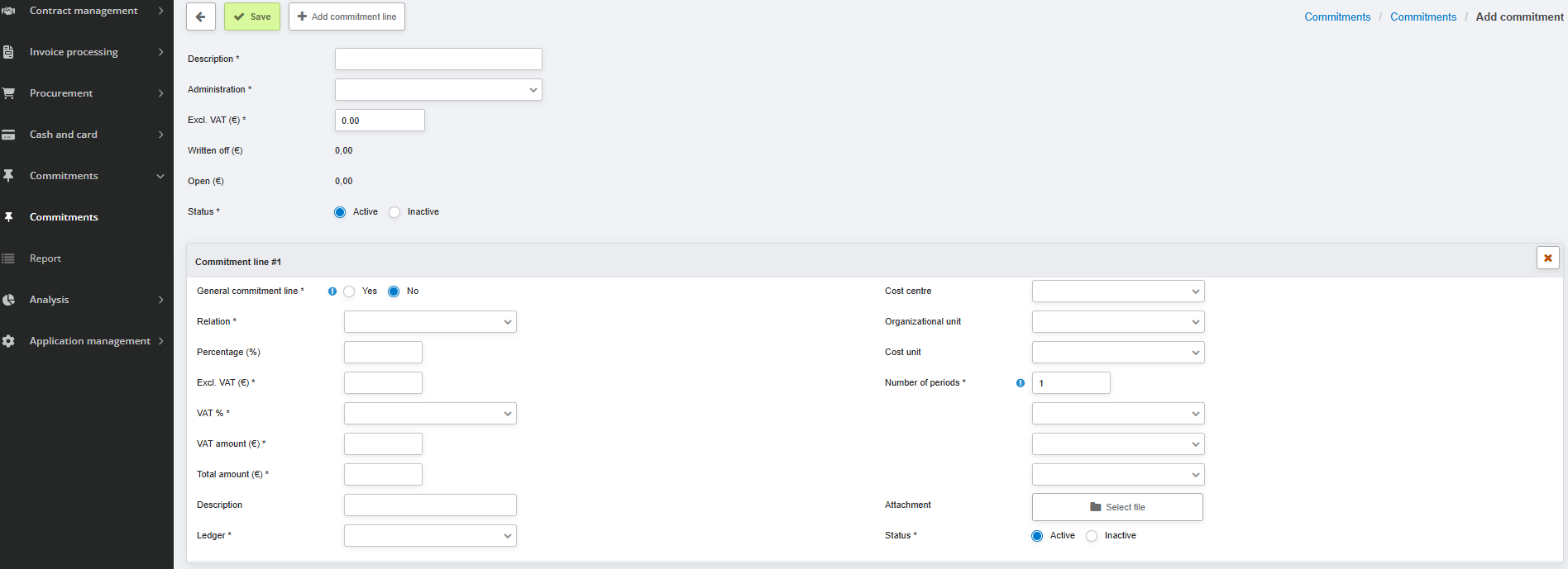 Once you have filled in all the details, you can click the 'Save' button at the top of the page. The commitment has now been created and will be displayed in the overview. Additionally, you can now select the commitment when an invoice for it arrives—unless you have set an effective date, in which case the commitment will only become available starting from that date.