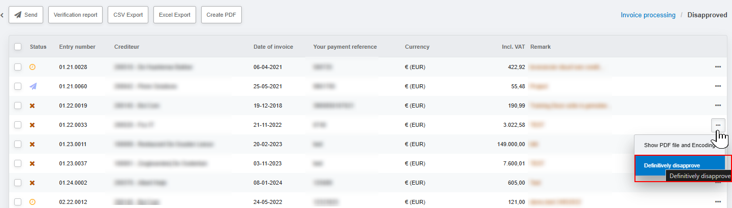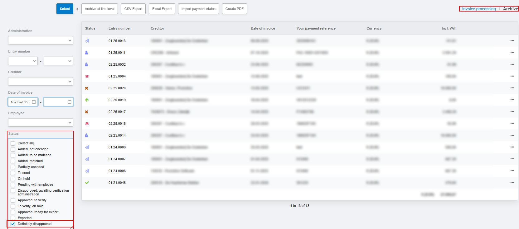 By permanently rejecting an invoice instead of deleting it, no gap is created in the invoice number sequence. Therefore, we recommend permanently rejecting over deleting. The invoice will then receive the status 'Permanently rejected' and will remain visible in Invoice Processing / Archive. If you wish to search for the invoice in the archive, you must select the status 'Permanently rejected'.