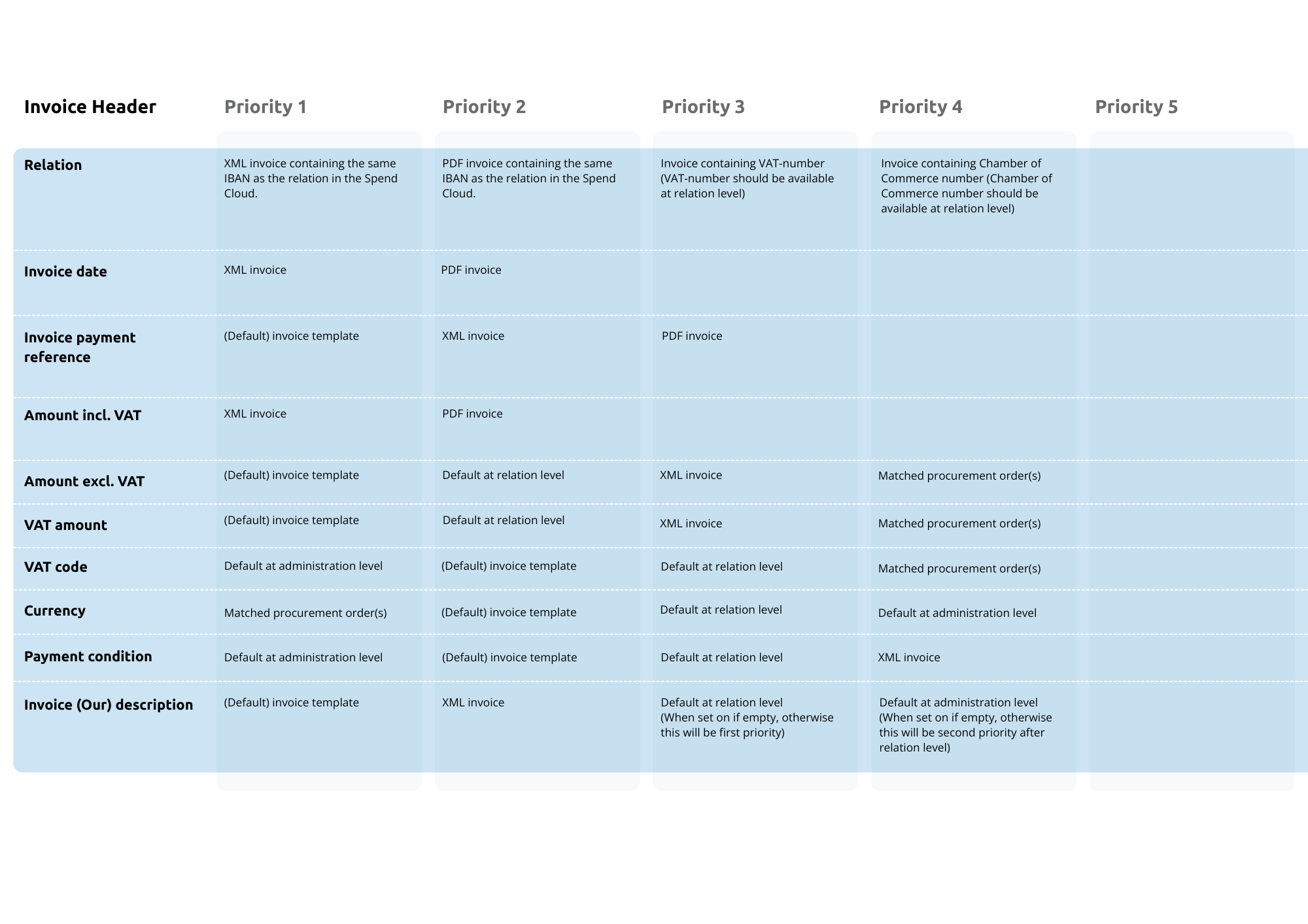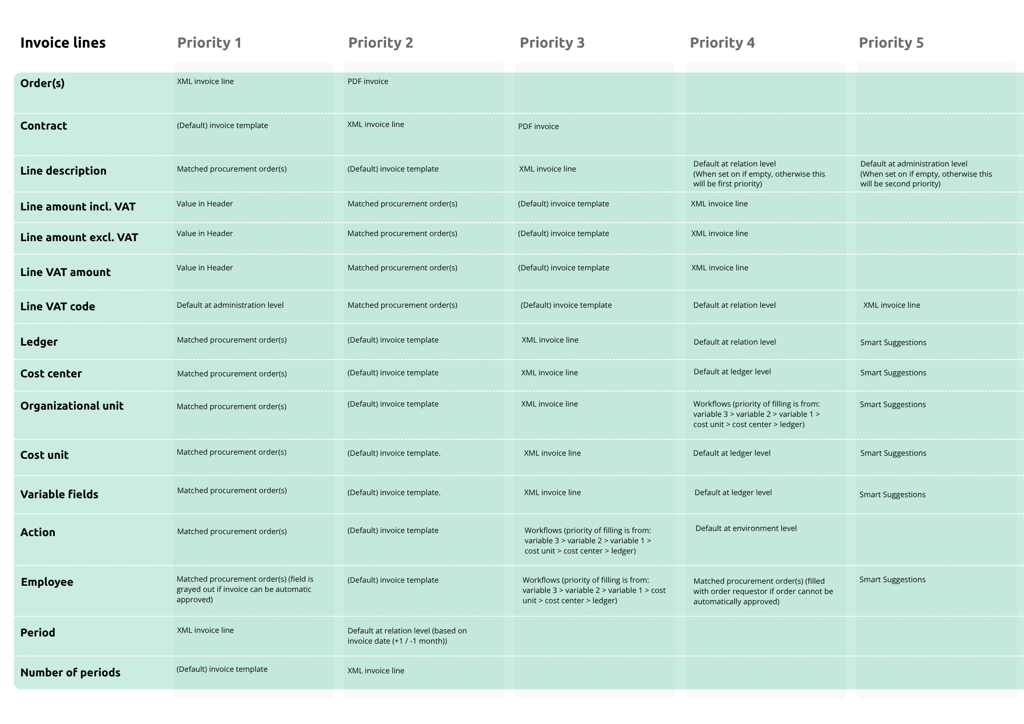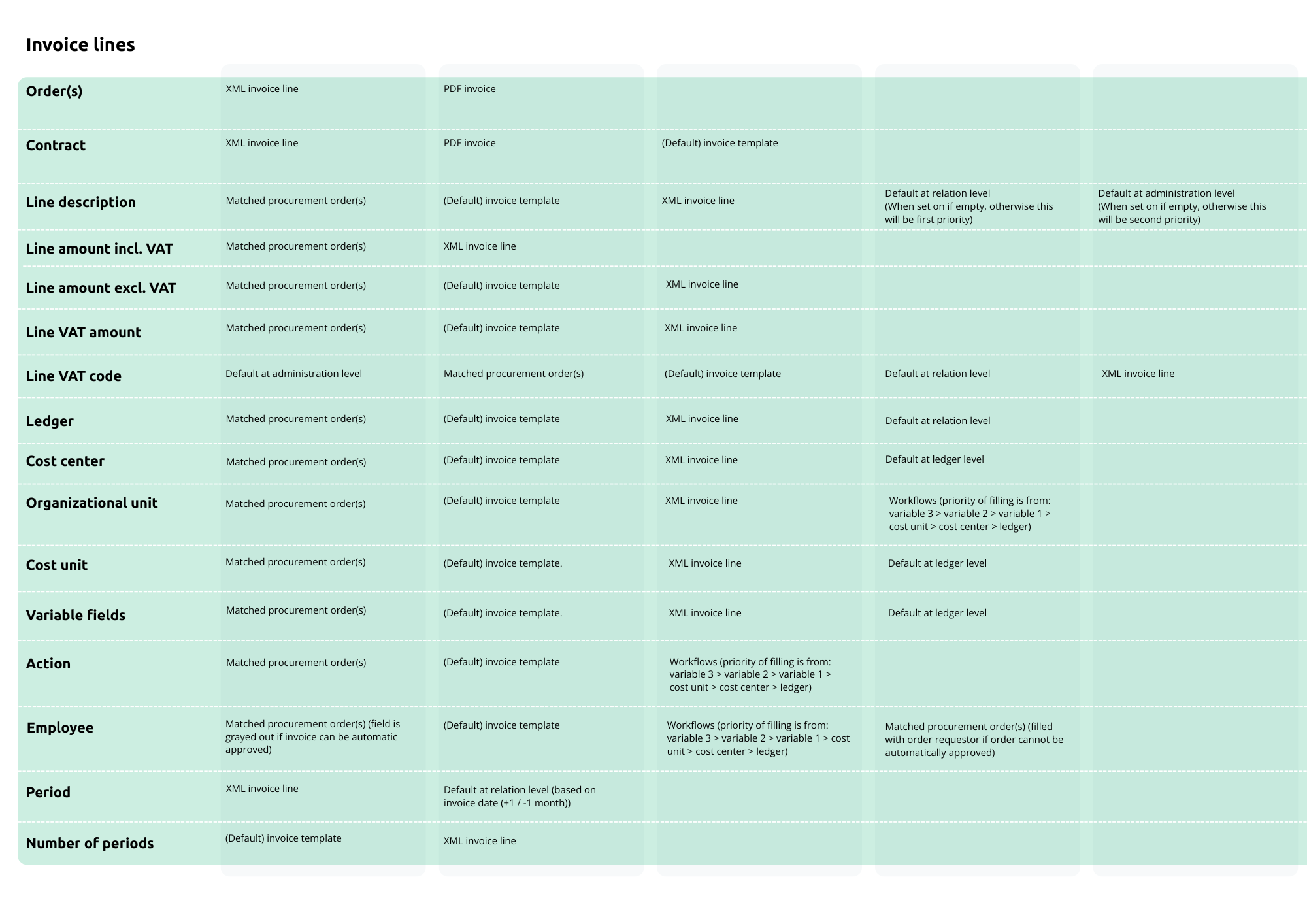These details can be read from the invoice. If you have set standard values or if the invoice is matched to an order, these details can be overwritten. Consider a standard VAT code or our payment reference for the relation, or the VAT code applied in a procurement order.