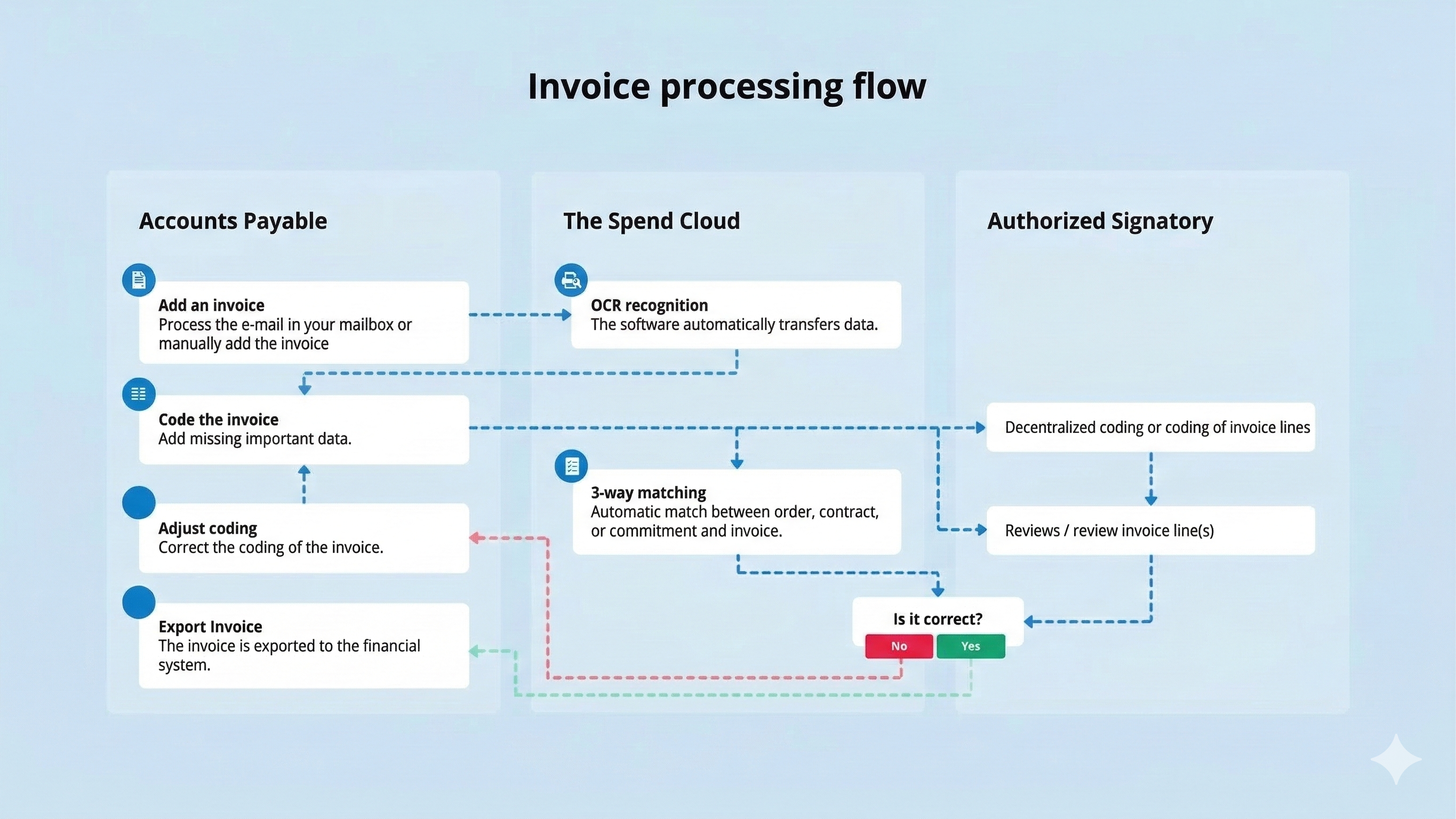 When a product or service is purchased, the creditor (supplier) will send a purchase invoice. This article outlines how the invoice processing process within the Spend Cloud aligns with this. The starting point is to strive for the ideal workflow, the so-called best practice method.