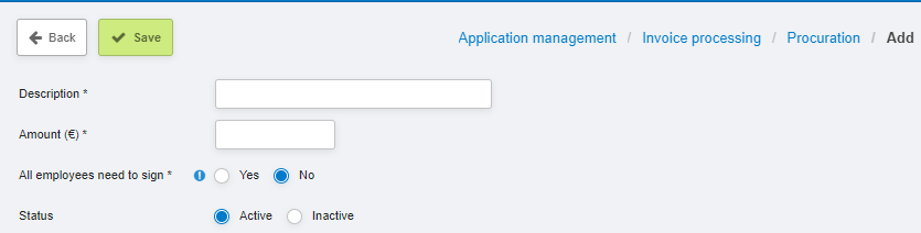 By clicking "Add" at the top of the overview, you can set up a new procuration level. Under "Amount," you can specify the amount up to which an employee can review invoices. Choosing "All employees sign" means that if you select "Yes" here, all employees within this organizational unit with this procuration level must approve the invoice line.