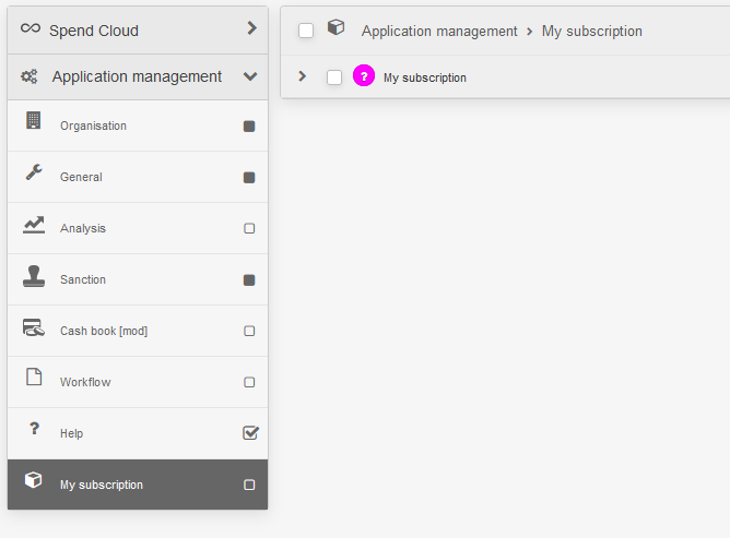 As the application and module administrator, you automatically have access to the ‘My subscription’ page. You can choose to make this access available to more or fewer employees via Application Management / Organisation / Permissions. This permission is found under ‘Application Management / My subscription’.