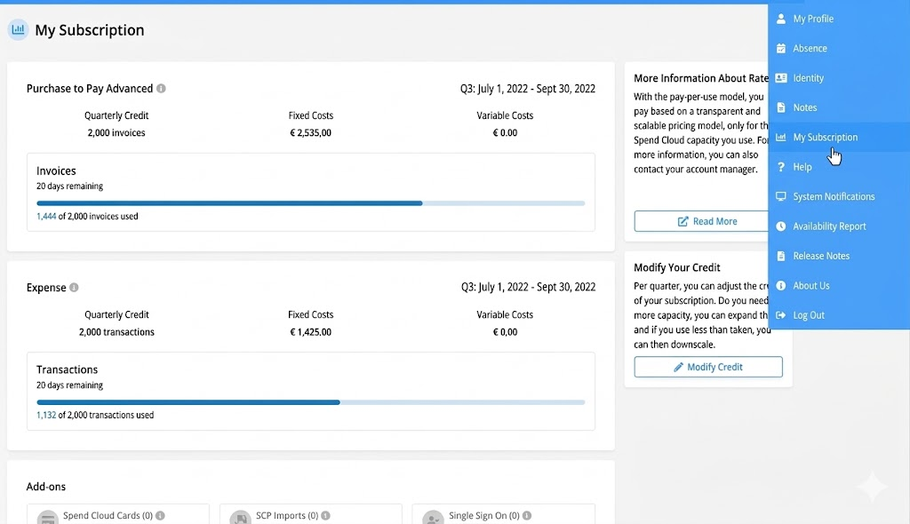 Using the Spend Cloud pay-per-use model means you have a concise and scalable pricing model and pay for the Spend Cloud capacity you use. Your subscription components and the number of invoices/transactions you use can be found in the Spend Cloud. With the right