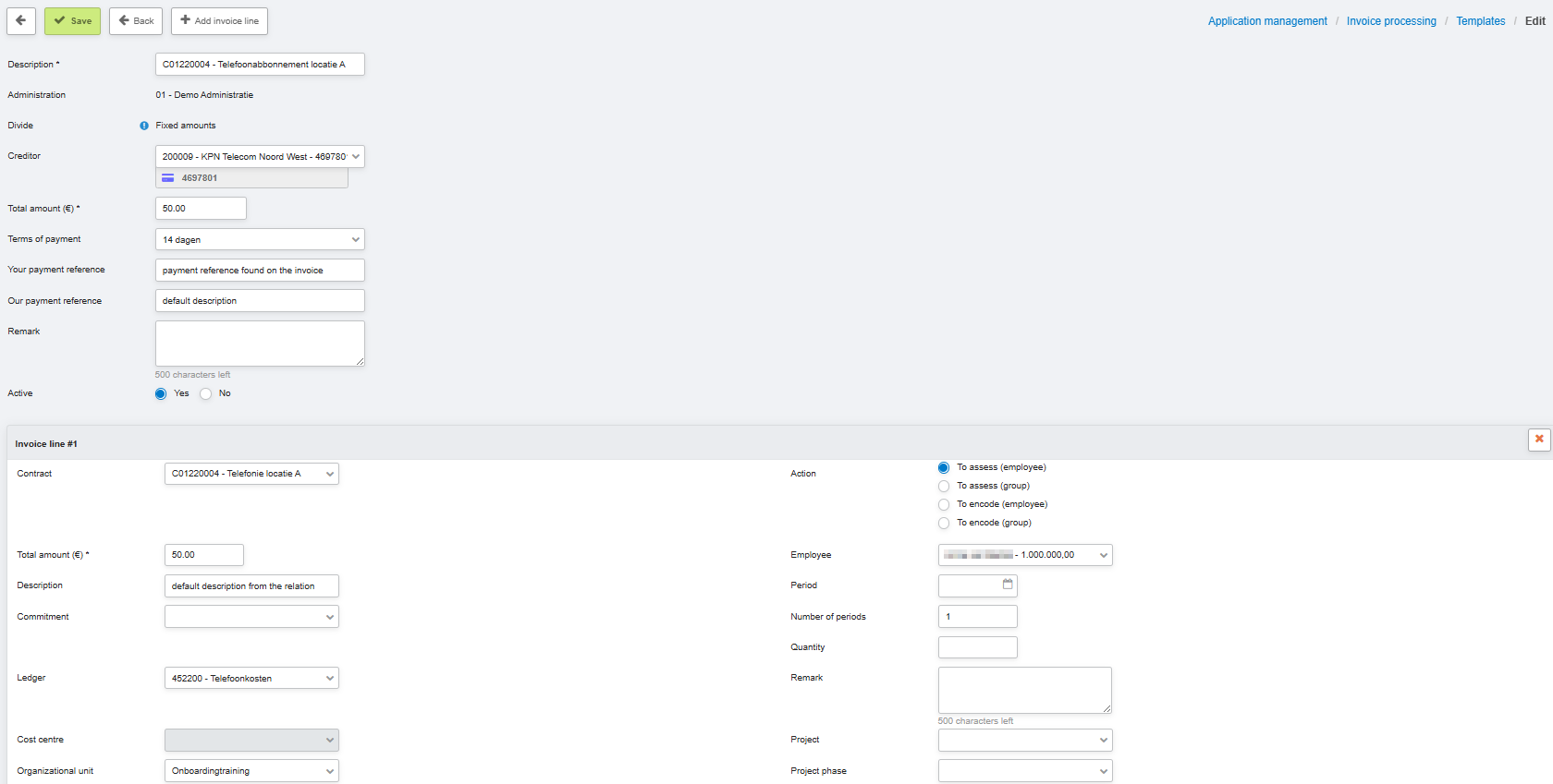 - The period is filled in based on the invoice date or the relation setting for a deviating period. Do you receive one invoice per month for one period? Then assign one period in the template. Does the invoice cover multiple periods? Then add multiple periods to the template.