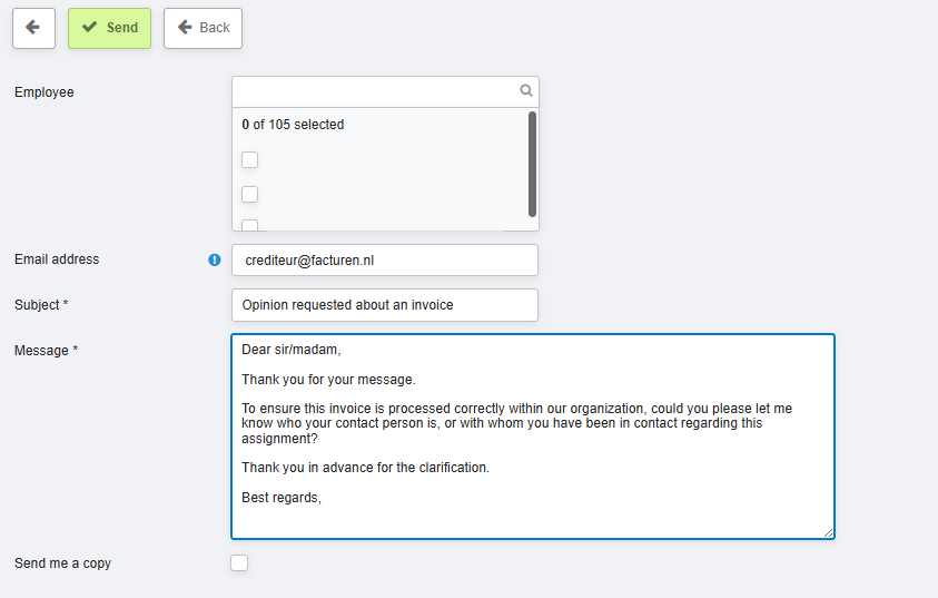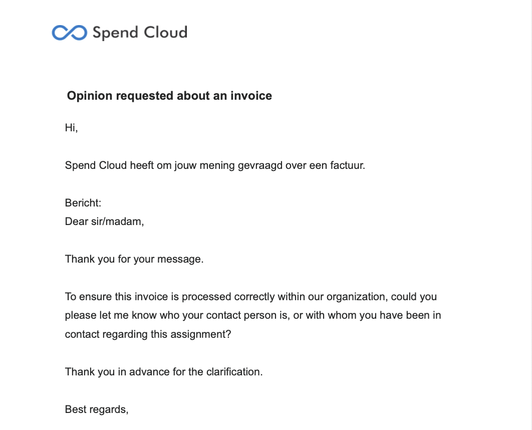 A new enhancement has been implemented in the Invoice Processing Inbox. When you click on an invoice and select the ‘Ask for opinion’ button, you can easily request feedback on a received message (see Image 1 below). After clicking this button (see Image 2), you first write a clarification or question. Then, you can specify who you want to forward the message to (see Image 3 for an email example). You can select one or more Spend Cloud employees or enter the sender's email address. This improvement makes it easier to quickly coordinate on invoices and contributes to a more efficient processing workflow.