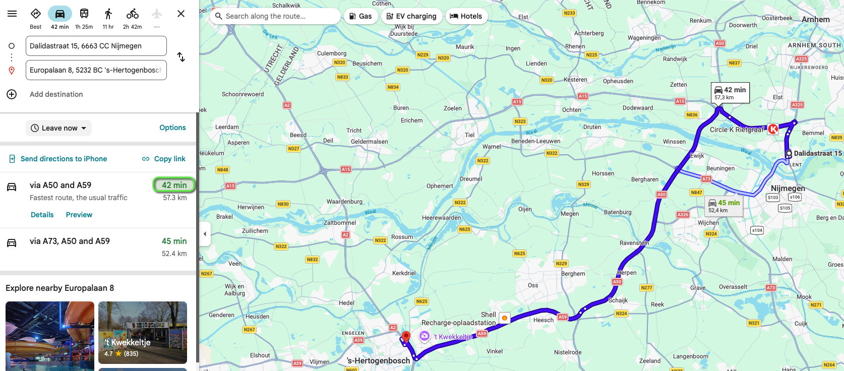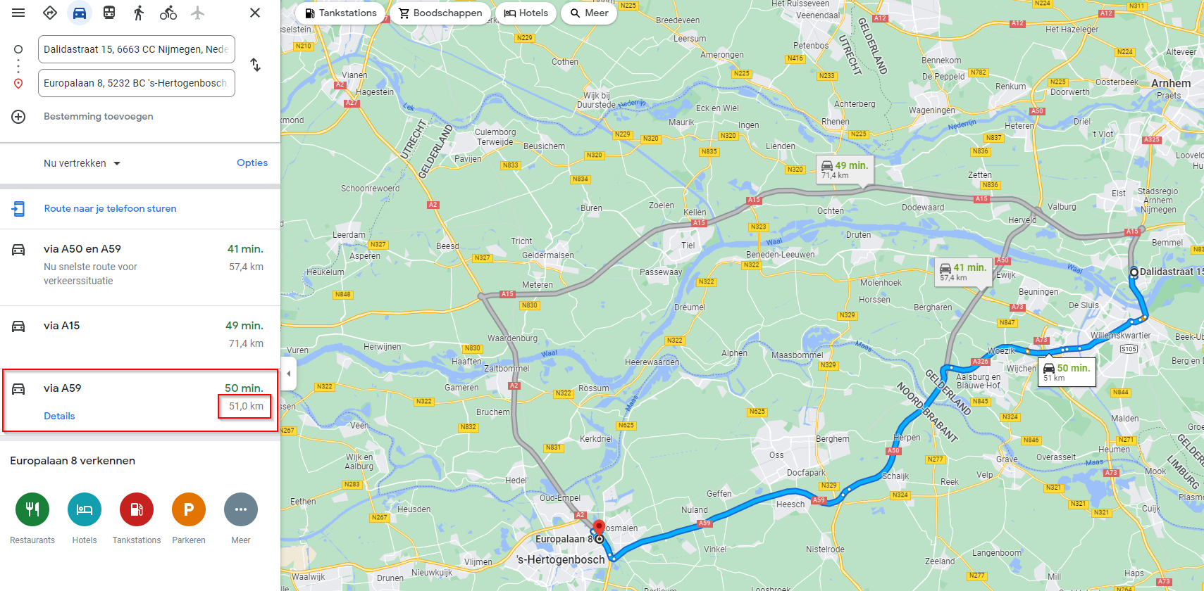 We see here that the upper route is longer than the lower route (namely 57.3 kilometers, instead of 52.4 kilometers), but this route is faster. Therefore, the Spend Cloud will take the upper number of kilomters for this trip, so 57.3 kilometers. Depending on the time of calculation, there may also be a difference in the number of kilometers depending on the time of creating the declaration. For example, suppose there is a traffic jam somewhere, Google Maps takes another route.
