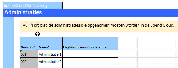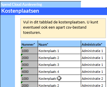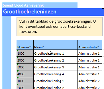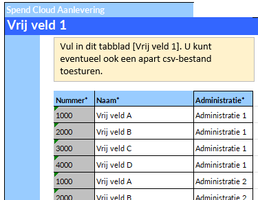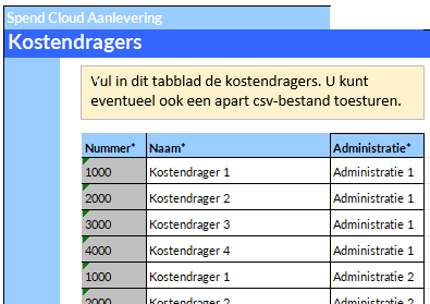 Indien er al gebruik gemaakt wordt van een andere module binnen de Spend Cloud zullen de financiële gegevens waarschijnlijk al aanwezig zijn in de Spend Cloud. Het aanleveren van de volgende tabbladen is in dat geval onnodig. Wanneer er geen koppeling gemaakt wordt tussen Spend Cloud Declareren en het financiële pakket (bijvoorbeeld doordat er gekoppeld wordt met het salarispakket) is het aanleveren van de tabbladen ook onnodig. Wanneer er gebruik gemaakt wordt van een webservice koppeling met het financiële pakket kunnen de stamgegevens opgehaald worden uit het financiële pakket en is aanleveren ook onnodig. Indien er gebruik gemaakt wordt van een bestandskoppeling met het financiële pakket zullen de volgende tabbladen aangeverd moeten worden.