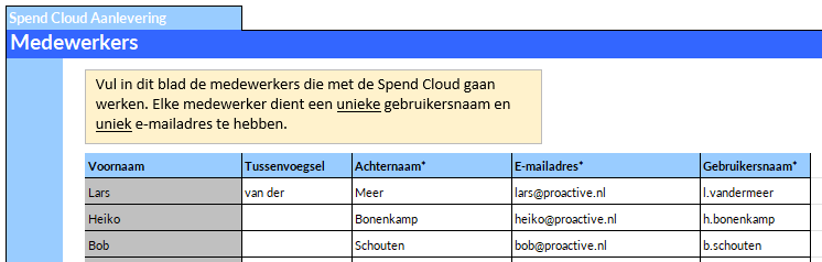 Vul in dit tabblad alle medewerkers die gebruik gaan maken van de SpendCloud. Als een medewerker hier niet tussen staat dan krijgen ze geen SpendCloud account en kunnen ze niet inloggen in de SpendCloud.