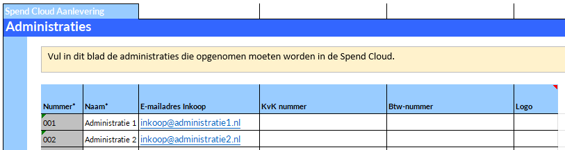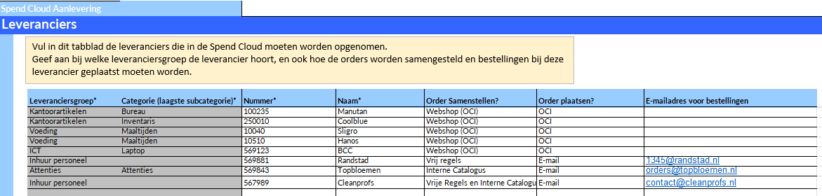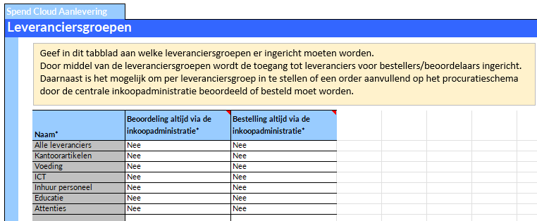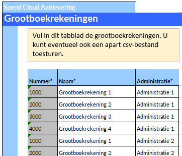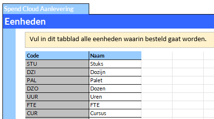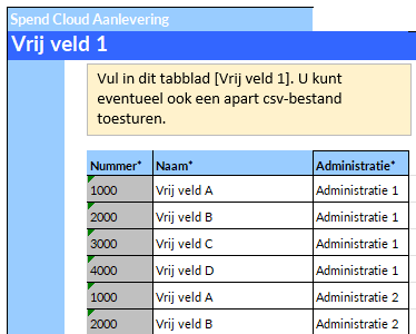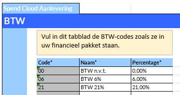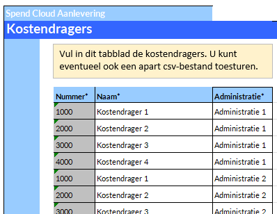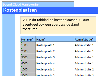 Indien er bij de implementatie sprake is van een webservice-koppeling of er wordt al gebruik gemaakt van een webservice-koppeling dan is het aanleveren van de volgende tabbladen onnodig. Ook wanneer er al een andere module in de Spend Cloud in gebruik is waardoor de stamgegevens al aanwezig zijn is het aanleveren onnodig: