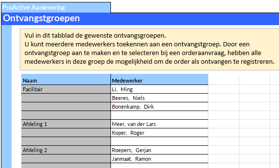 U kunt meerdere medewerkers toekennen aan een ontvangstgroep. Door een ontvangstgroep aan te maken en te selecteren bij een orderaanvraag, hebben alle medewerkers in deze groep de mogelijkheid om de order als ontvangen te registreren.