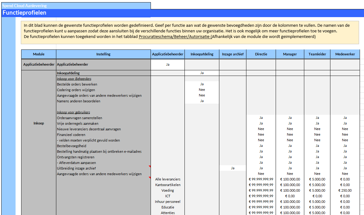 Het gebruiken van functieprofielen zorgt ervoor dat je SpendCloud omgeving makkelijk is in beheer en zorgt ervoor dat je medewerkers nooit buiten hun budget kunnen bestellen, want dat heb je in het functieprofiel vastgelegd. Voor meer info over functieprofielen klik hier