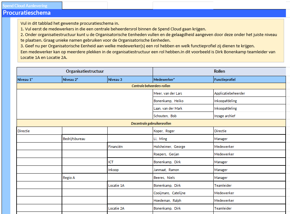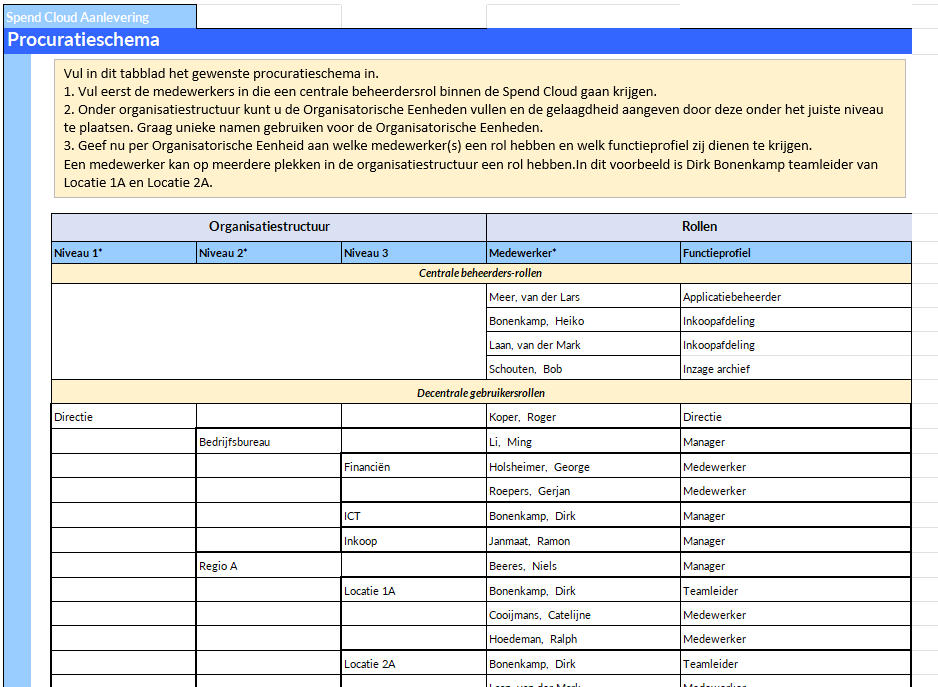 In dit tabblad bouw je je organisatie na. Als Organisatiestructuur kun je de kostenplaatsen aanhouden of afdelingen binnen je organisatie. Bij medewerker zet je dan de medewerker die daar werkt. En als laatste bij de kolom functieprofiel vul je dan de functie van die medewerker in. Daarmee heeft de medewerker een rol gekregen in de structuur. Bij Centrale beheerders-rollen vul je alle medewerkers in die verantwoordelijk zijn voor de administratie of het applicatiebeheer van de SpendCloud. Voor meer info over rollen klik hier.