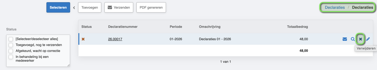 - de declaratie in zijn geheel verwijderen. Om de declaratie te verwijderen, klik je op het kruisje dat je ziet aan het einde van de regel: