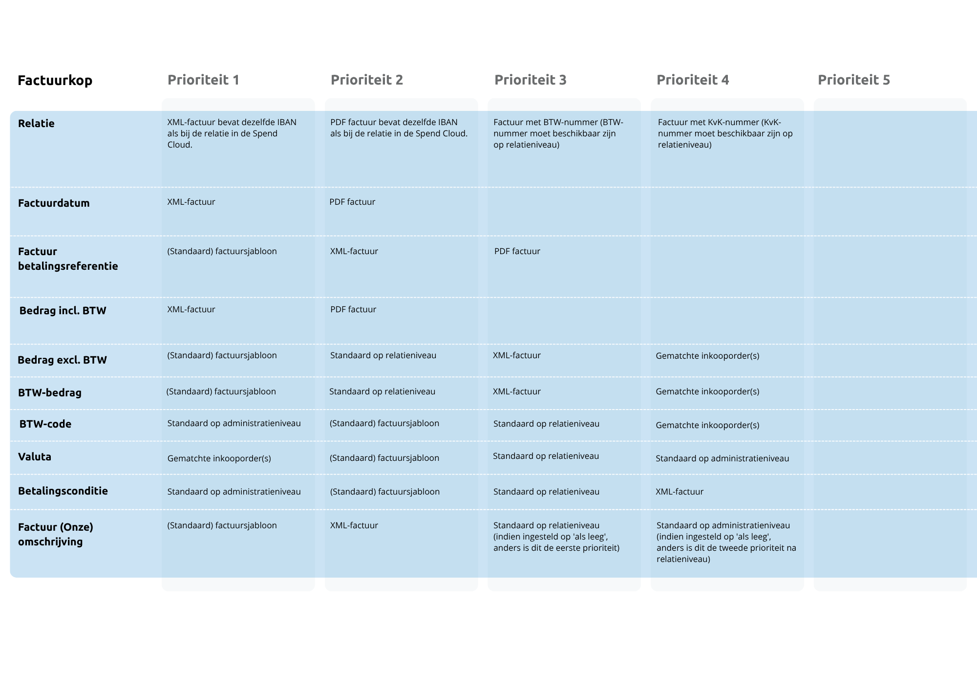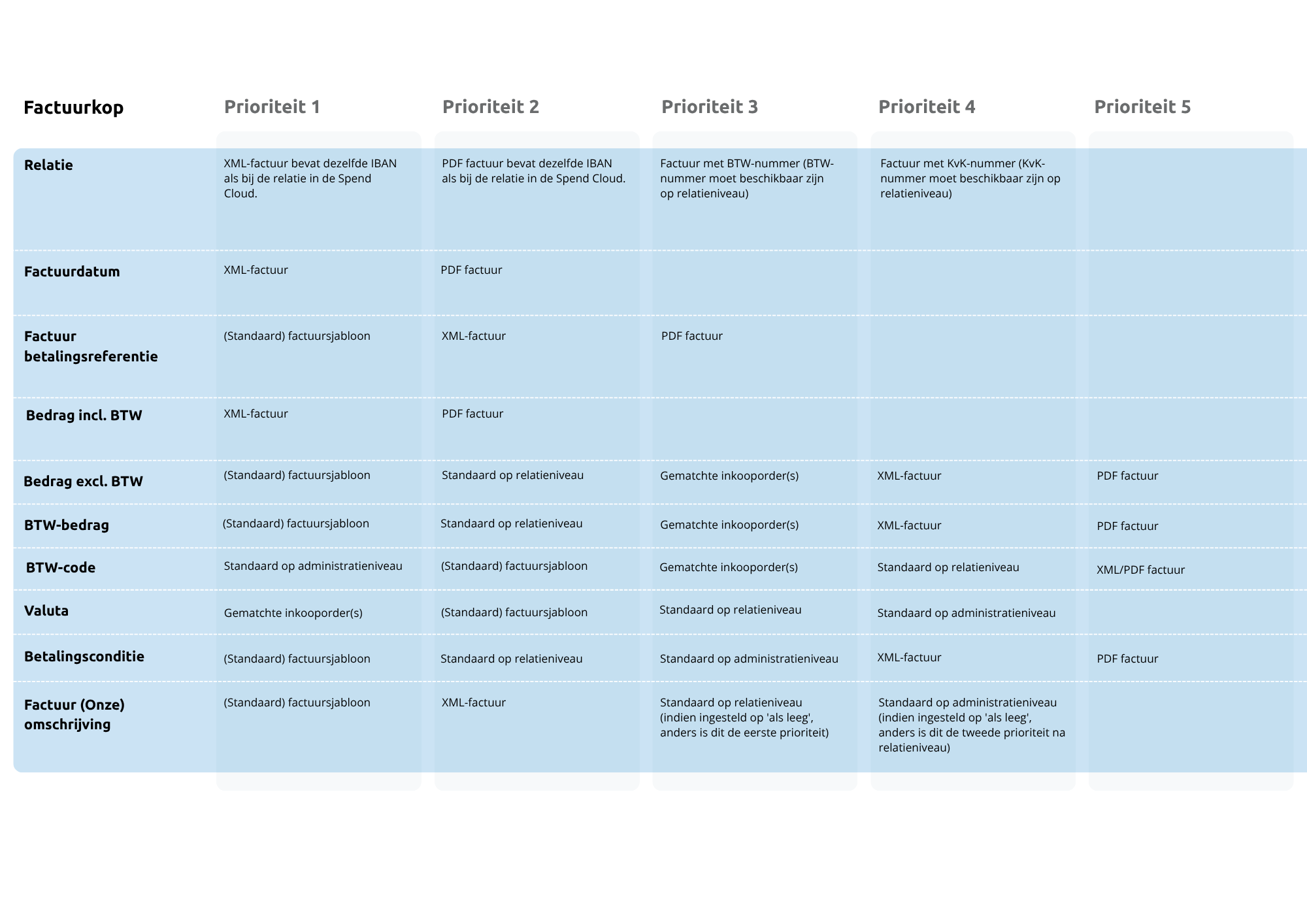 Bij een XML-factuur wordt er een XML-factuur veldindeling toegepast op de factuur om de gegevens uit de XML zoveel mogelijk over te nemen in de Spend Cloud. Indien dit niet mogelijk is zullen we terugvallen op SmartScan om bepaalde gegevens alsnog uit de bij de XML geleverde PDF te halen. Hoe meer velden vooraf ingevuld zijn, des te minder werk je hebt aan het coderen van een factuur.