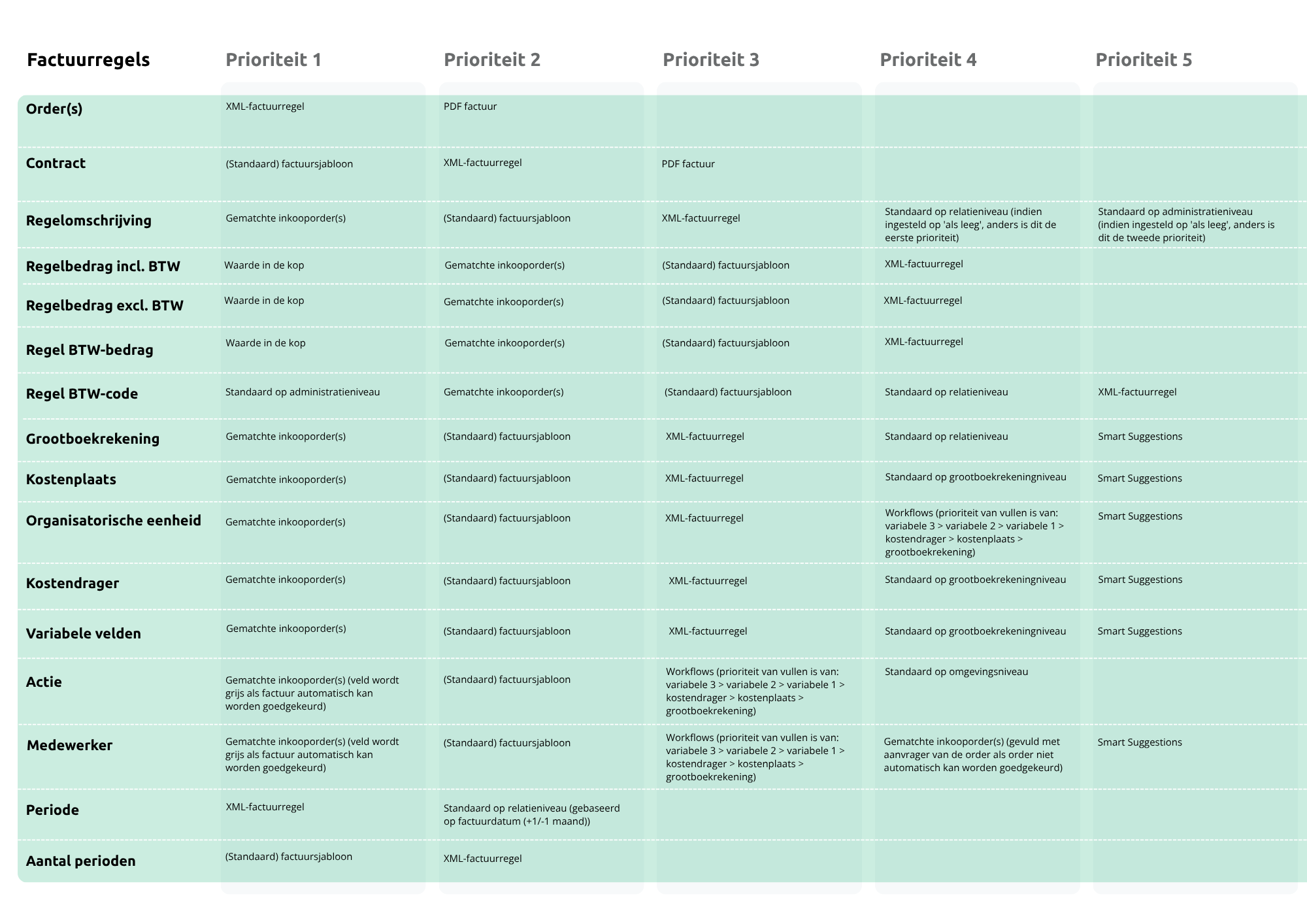 Hieronder lees je meer informatie over de verschillende manieren om gegevens automatisch in te laten vullen bij het coderen van facturen. De Spend Cloud houdt per codeerveld een vaste hiërarchie aan om te bepalen op basis van welke automatisering een veld wordt ingevuld. Bijvoorbeeld: Een factuur wordt gematcht aan een order, maar er is ook een standaard grootboekrekening ingesteld op relatieniveau. Als er bij de order een andere grootboekrekening is gecodeerd zal deze worden ingevuld in de codering. Deze krijgt dus prioriteit over de standaard-waarde bij de relatie. Welke automatisering je instelt en waar heeft dus impact op de gevulde waarden. Het is dus belangrijk dat je rekening houdt met de hiërarchie van deze velden.