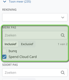 Via het filter kan je de selectie aanpassen van de passen die worden getoond in het scherm. Op het moment dat je 'Spend Cloud' kiest in het filter, zie je het aantal Spend Cloud Cards waarvoor jouw organisatie wordt gefactureerd.