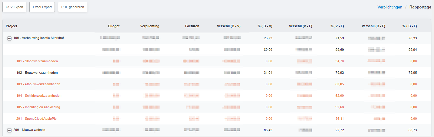 Bij het menu-onderdeel Rapportage zie je een overzicht, waarin de actuele financiële gegevens van een project inzichtelijk zijn.