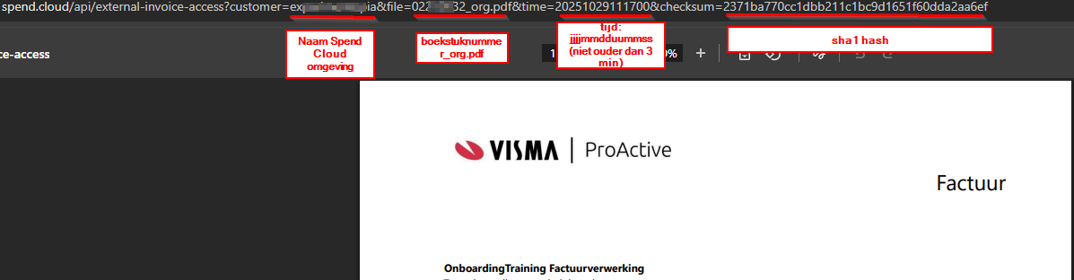 https://spend.cloud/api/external-invoice-access?customer=klantnaam&file=09207160021_org.pdf&time=1257953055&checksum=4b036398bf0014aa754b702ffd2bff9c7451af29'customer' is altijd een vaste waarde per klant, over het algemeen de naam van de klant in kleine letters. Deze waarde wordt verstrekt door Visma | ProActive.